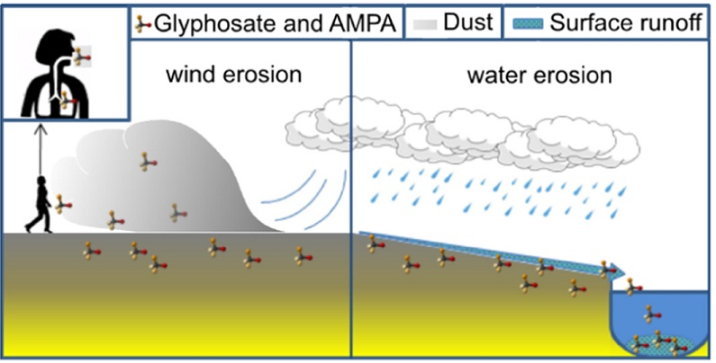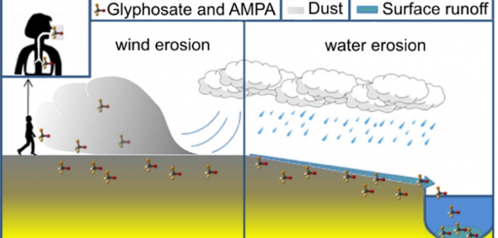 Oltre a essere trasportati dal vento, glifosato e AMPA possono anche attaccarsi alle particelle del suolo e finire nell’acqua superficiale.