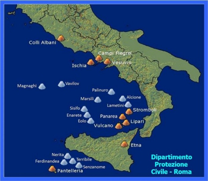 Mappa dei vulcani Italiani e mari prospicenti