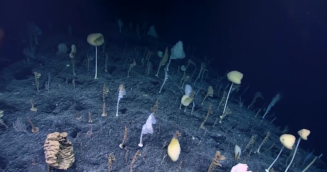 Monument Waters Around Johnston Atoll” l’hanno individuata dopo aver rivelato dai sensori del piccolo sommergibile un cambiamento della corrente marina. Seguendola si sono imbattuti in un tappeto di migliaia di poriferi (il nome scientifico delle spugne), sia vivi che morti, tutti quanti rivolti nella direzione della corrente. Questi organismi primitivi sono infatti filtratori, e in questo modo riescono a raccogliere le particelle alimentari trasportate dal flusso dell’acqua. Nella maggior parte dei casi si trattava di cosiddette ‘spugne di vetro’, sollevate da uno stelo come fiori in un prato. Si chiamano così poiché possiedono uno scheletro composto da microscopiche spicole di silice molto simili al vetro. La spugna più conosciuta di questo gruppo è il “cestello di Venere” (Euplectella aspergillum), una specie che viene raccolta e fatta essiccare per scopi decorativi. È nota perché ospita all’interno una coppia di gamberetti per tutta la loro vita (vi entrano da larve e quando sono adulti non riescono più ad uscirne), per questa ragione in alcuni paesi asiatici viene scelta come dono nuziale di fedeltà.