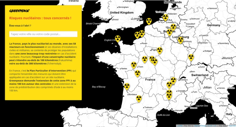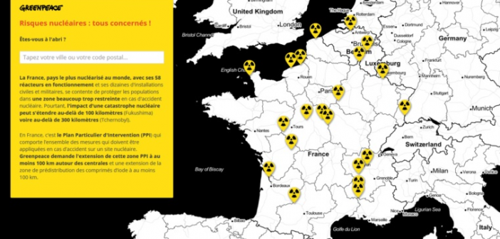 La carta di Greenpeace punta a far vedere i rischi che corrono i francesi in caso di incidente nucleare e permette di identificare le centrali più vicine al luogo dove si abita e di capire quale potrebbe essere l’estensione della contaminazione radioattiva nel caso di una catastrofe del tipo di quella di Chernobyl o di Fukushima Daiichi.