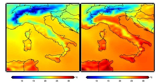 Al contempo tali proiezioni evidenziano una diminuzione della piovosità del 10-20% durante le estati (e primavere) più secche. Se invece si considera il ventennio successivo (2046-2065), allora le suddette proiezioni indicano, per lo stesso scenario, un’anomalia estiva di temperatura media totalmente confrontabile con quella dell’ultima estate, ovvero intorno ai 2-3 °C. Simulazioni ad alta risoluzione eseguite da ISAC-CNR con il modello globale EC-Earth, nello scenario più estremo RCP8.5 prevedono per la metà di questo secolo un aumento delle temperature estive superiore ai 3°C rispetto al presente su tutta Italia (vedi figura allegata).