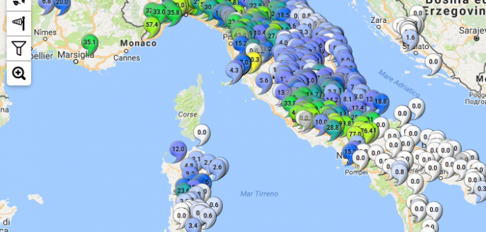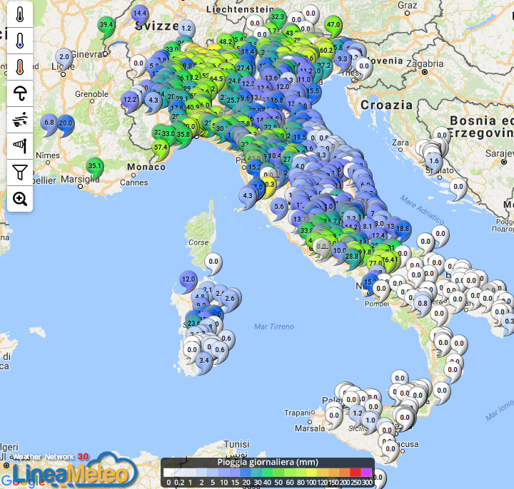 La pioggia caduta sull’Italia nella giornata del 6 novembre (fonte lineameteo), in copertina invece quella caduta domenica 5 novembre