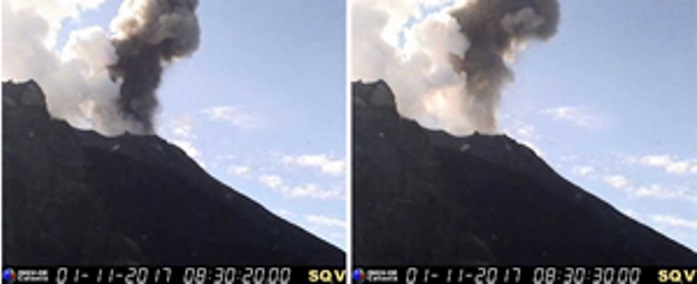 Alle 9.29 (ora italiana) del primo novembre 2017, sullo Stromboli si è verificata una sequenza esplosiva della durata complessiva di circa 3 minuti, con caratteristiche simili a quella avvenuta lo scorso 23 ottobre. L’analisi delle immagini delle telecamere termiche e in visibile di sorveglianza ha mostrato che la sequenza ha avuto inizio con un evento di maggiore intensità dall’area craterica centro-meridionale, seguito da alcune esplosioni minori nei minuti successivi (Fig. 1).