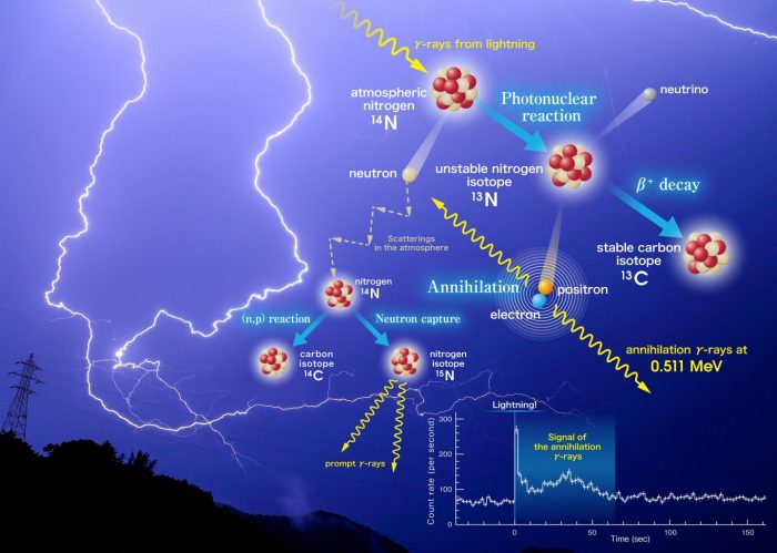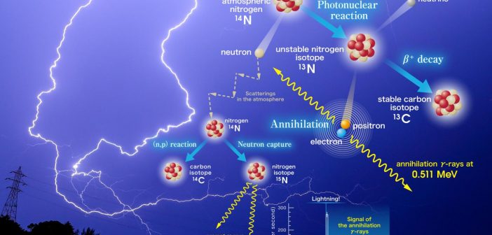L’ipotesi è avanzata in un articolo appena pubblicato su Nature, dove un gruppo di ricercatori giapponesi, guidati da Teruaki Enoto dell’Università di Kyoto, descrive come i raggi gamma emessi dai fulmini reagiscano con l’aria per produrre radioisotopi e anche positroni, l’equivalente antimaterico degli elettroni.