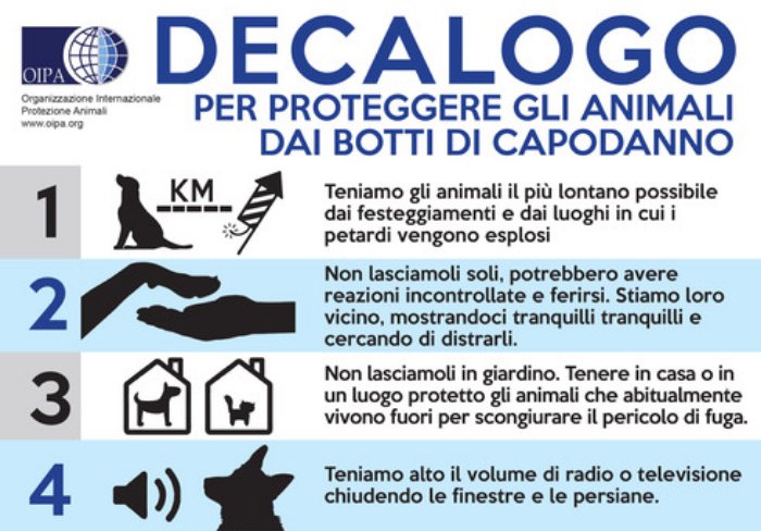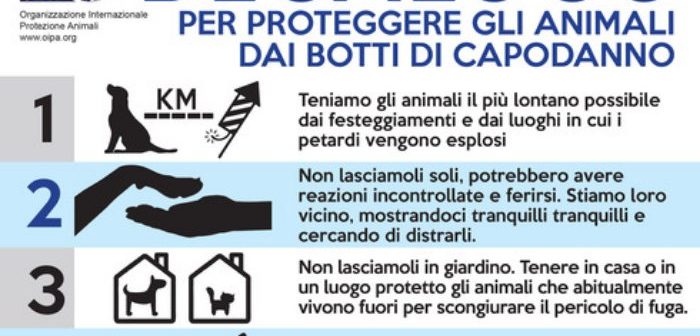 L’ong indica un decalogo per proteggere gli animali suggerendo di tenerli lontano dai festeggiamenti e dai luoghi in cui vengono esplosi i petardi, non tenerli soli, nè in giardino e farli rifugiare dove vogliono; non tenere alto il volume di radio e tv; tenerli al guinzaglio durante le passeggiate; evitare tranquillanti; nei mesi precedenti far visitare gli animali da un veterinario comportamentalista che prescriverà la terapia da seguire, sia comportamentale che, nel caso si necessario, farmacologica; organizzare con anticipo una gita fuori porta per trascorrere i due giorni a cavallo dei festeggiamenti di Capodanno, generalmente quelli in cui l’incidenza degli scoppi di petardi è maggiore, in luoghi lontano dai centri urbani e dai rumori forti e improvvisi. Infine, sensibilizzare l’opinione pubblica, e soprattutto i bambini, su quanto questi inutili rumori possano essere dannosi per i quattro zampe.