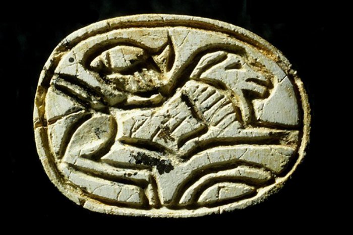 Lo scarabeo egizio ritrovato sul petto della bambina raffigura un leone accucciato e il sole che sorge su una collina. Fotografia per gentile concessione Sapienza Università di Roma