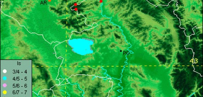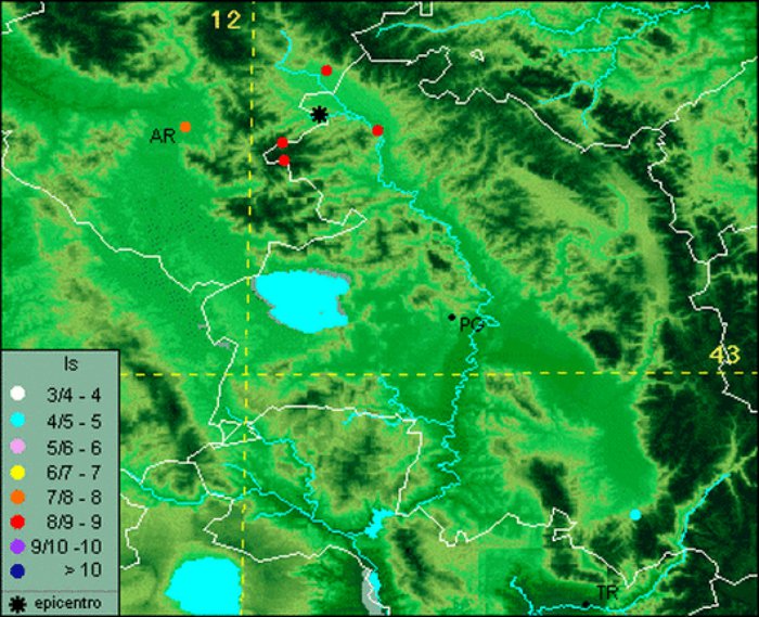 Ricostruzione grafica dell’intensità percepita del sisma del 1352 (scala Mercalli), sulla base delle fonti storiche. I simboli indicano Monterchi (*), Sansepolcro, Città di Castello, Marzana e Elci (rosso), Arezzo (arancio) e Spoleto (celeste)