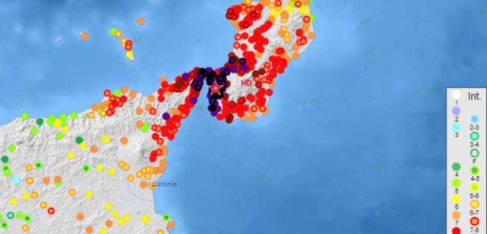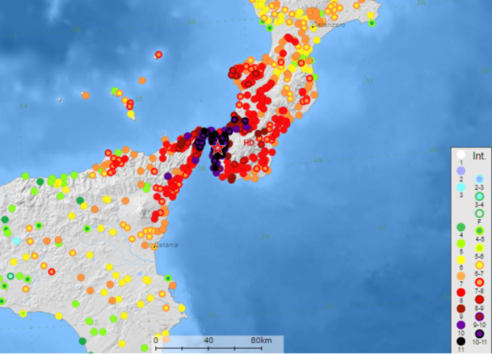 Localizzazione degli effetti classificati del terremoto del 28 dicembre 1908 (da Guidoboni e Mariotti 2008).
