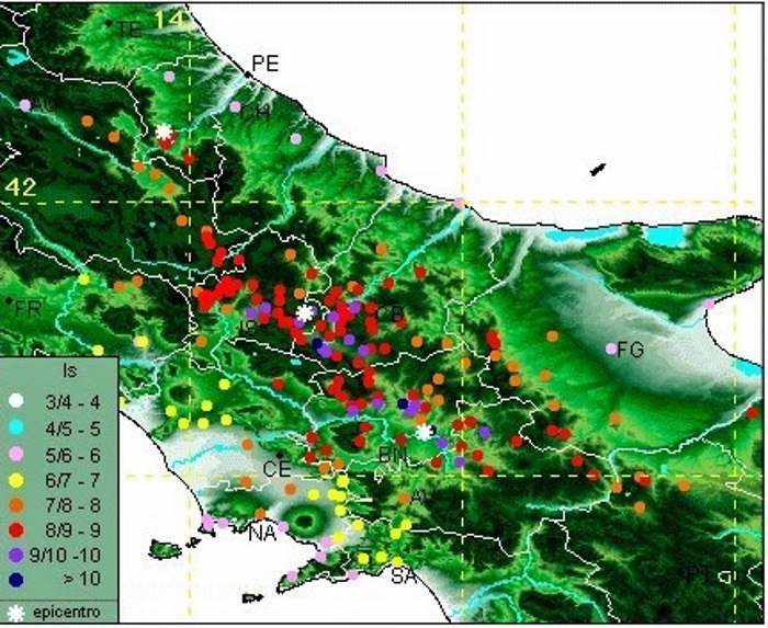 La prima scossa si verifica nella notte del 5 dicembre 1456. La magnitudo, stimata in base alla distribuzione degli effetti macrosismici, è di 6.9. Il terremoto colpisce soprattutto il Sannio e l’Irpinia con effetti devastanti nelle cittadine di Apice e Paduli. Danni importanti si registrano anche ad Ariano, prossimo all’epicentro, nella Capitanata pugliese, e perfino a Napoli, dove crolla il campanile della chiesa di Santa Chiara. A meno di un mese di distanza si verifica un altro evento rilevante che colpisce però un’area localizzata più a nord. La magnitudo è simile a quella dell’evento precedente. Il terremoto produce danni gravi nella zona del Matese, ad Isernia, Boiano, Campobasso e nell’intero Molise, con gli effetti più importanti a Frosolone, vicino all’epicentro, e Vinchiaturo, con risentimenti degli effetti che coinvolgono anche alcune aree della Puglia. Nel gennaio 1457, la sequenza sismica si chiude con un terremoto di magnitudo stimata intorno a 6.0 che colpisce l’Abruzzo, in particolare il comprensorio delle Majella e del Gran Sasso. L’epicentro viene localizzato nei pressi di Tocco da Casauria e Caramanico, dove si registrano gli effetti più gravi (fig. 3).
