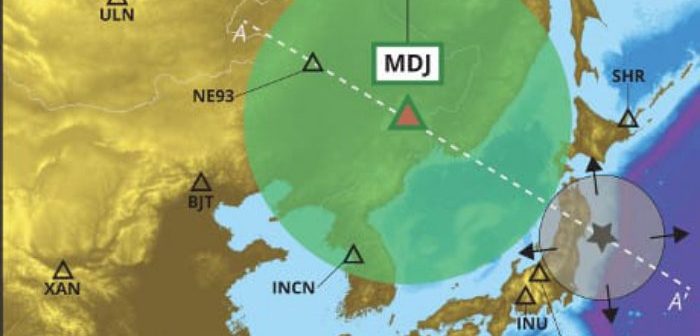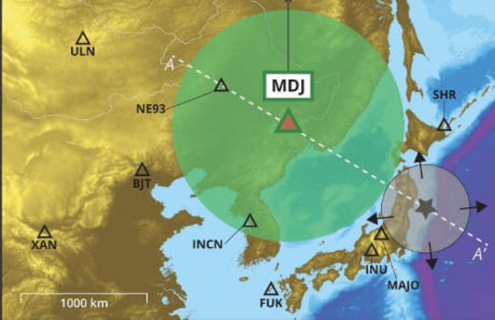 Mappa della disposizione dei sismografi (indicati dai triangolini) che hanno rilevato le onde sismiche pochi minuti dopo il terremoto di Tohoku dell’11 marzo 2011. Gli autori hanno analizzato in particolare i segnali rilevati dalla stazione indicata dalla sigla MDj (triangolino rosso al centro) a 1280 chilometri di distanza dall’epicentro (Credit: IPGP/2017)