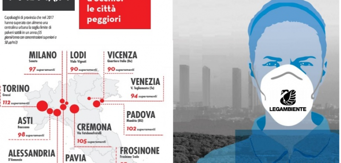 E mentre in campagna elettorale si discute di tutt’altre cose, la qualità dell’aria continua a lasciare a desiderare e il Cigno Vere, dopo il confronto tra “l’aria che tira in alcune città italiane ed europee”, ora fa il punto sull’inquinamento atmosferico made in Italy e da Mal’aria emerge che, «Nel 2017 in ben 39 capoluoghi di provincia italiani è stato superato, almeno in una stazione ufficiale di monitoraggio di tipo urbano, il limite annuale di 35 giorni per le polveri sottili con una media giornaliera superiore a 50 microgrammi/metro cubo. Le prime posizioni della classifica sono tutte appannaggio delle città del nord (Frosinone è la prima del Centro/Sud, al nono posto), a causa delle condizioni climatiche che hanno riacutizzato l’emergenza nelle città dell’area del bacino padano. Su 39 capoluoghi, ben cinque hanno addirittura oltrepassato la soglia di 100 giorni di smog oltre i limiti: Torino (stazione Grassi) guida la classifica con il record negativo di 112 giorni di livelli di inquinamento atmosferico illegali; Cremona (Fatebenefratelli) con 105; Alessandria (D’Annunzio) con 103; Padova (Mandria) con 102 e Pavia (Minerva) con 101 giorni. Ci sono andate molto vicina anche Asti (Baussano) con 98 giorni e Milano (Senato) con le sue 97 giornate oltre il limite. Seguono Venezia (Tagliamento) 94; Frosinone (Scalo) 93; Lodi(Vignati) e Vicenza (Italia) con 90».