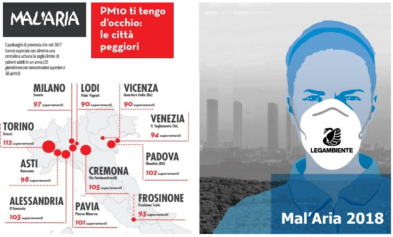 Mal’aria 2018 contiene inoltre un focus “Che aria tira in città: il confronto con i dati europei” e, secondo i dati elaborati da Legambiente a partire dall’ultimo report del 2016 dell’Organizzazione mondiale della Sanità, «Le principali città italiane sono tra le più critiche a livello europeo per quanto riguarda l’inquinamento atmosferico»,. L’associazione ambientalista ha confrontato le medie annuali di PM10 di 20 grandi città di Italia, Spagna, Germania, Francia, e Regno Unito (dati 2013) e conclude: «I valori peggiori relativi alla concentrazione media annuale di polveri sottili (Pm10) si registrano proprio in Italia: a Torino (39 microgrammi/metrocubo di Pm10), Milano (37) e Napoli (35), che primeggiano sulle sorelle europee come Siviglia, Marsiglia e Nizza dove invece si registra una concentrazione media annuale di Pm10 di 29 μg/mc. Roma si piazza, insieme a Parigi, al settimo posto con una concentrazione media annua di 28 μg/mcs, seguono gli altri centri urbani europei con valori di gran lunga più bassi. Negli anni successivi al 2013, la situazione delle quattro città italiane non è migliorata: la media annuale di PM10 a Torino è stata di 35 microgrammi/mc nel 2014, 39 nel 2015 e 36 nel 2016; a Milano è stata nei tre anni 35-41-36; a Napoli è stata 29 nel 2014 e nel 2015 e 28 nel 2016. A Roma, dai 29 microgrammi per metro cubo del 2014 si è passati a 31 nel 2015 e di nuovo a 29 nel 2016».