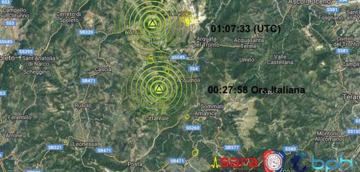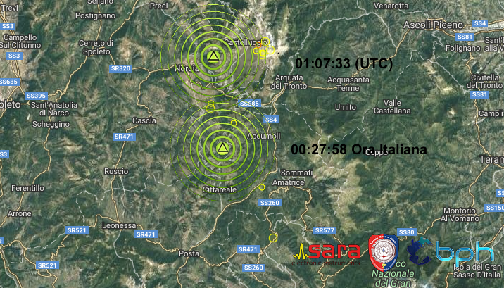Sia con orario locale che con orario UTC, le prime due scosse di terremoto sono avvenute nella zona tra Norcia, Cascia e il confine con il Reatino