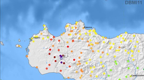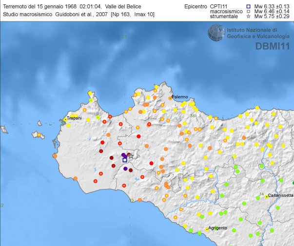 Distribuzione degli effetti del terremoto del 15 gennaio 1968 secondo lo studio di Guidoboni et al. (2007) [fonte: DBMI11]