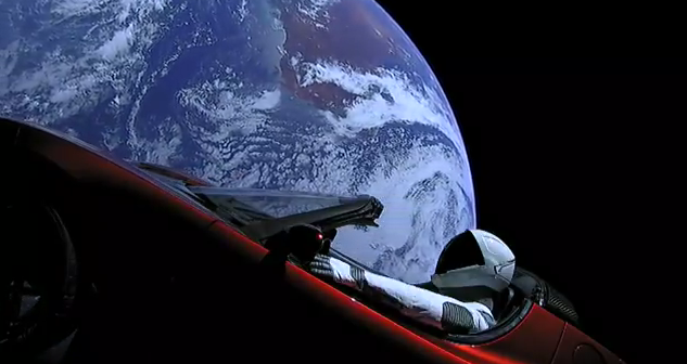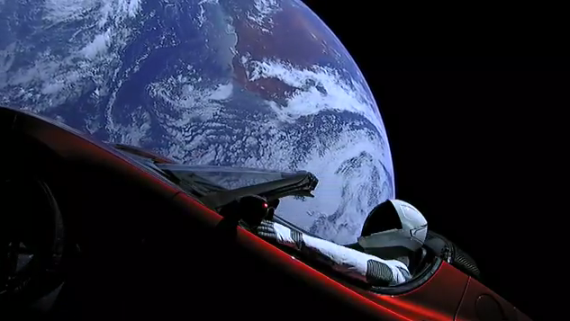 Le prime immagini arrivate a Terra mostrano uno spettacolo da fantascienza: un’auto rosso ciliegia sta sfrecciando nello spazio, mentre al volante c’è Starman, il manichino vestito da astronauta, anche questo dedicato alla canzone di Bowie, e la sua radio trasmette ‘Space Oddity’. Nel cassetto dei cruscotto non poteva mancare una copia della “Guida galattica per autostoppisti” con tanto di asciugamano con la scritta “Don’t Panic”.