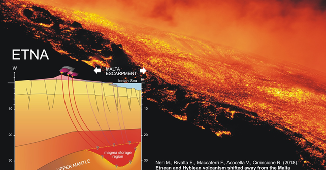 Potrebbe essere la Scarpata di Malta, la sorgente dei magmi che alimenta le eruzioni dell’Etna e che, in passato, ha dato vita ai vulcani dei Monti Iblei, oggi estinti. A svelarlo, lo studio, Etnean and Hyblean volcanism shifted away from the Malta Escarpment by crustal stresses, condotto da un team di ricercatori dell’Istituto Nazionale di Geofisica e Vulcanologia (INGV), German Centre for Geosciences (GFZ) di Potsdam, Università degli Studi Roma Tre e di Catania.