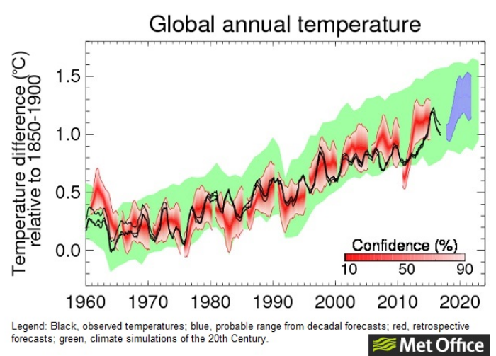 Stephen Belcher, Met Office Chief Scientist, ha sottolineato: «Considerando che negli ultimi tre anni abbiamo assistito a temperature medie globali intorno a 1° C sopra i livelli preindustriali, è ora possibile che il riscaldamento continuo da gas serra, insieme alla variabilità naturale, potrebbero combinarsi in modo da superare temporaneamente gli 1,5° C nei prossimi cinque anni».