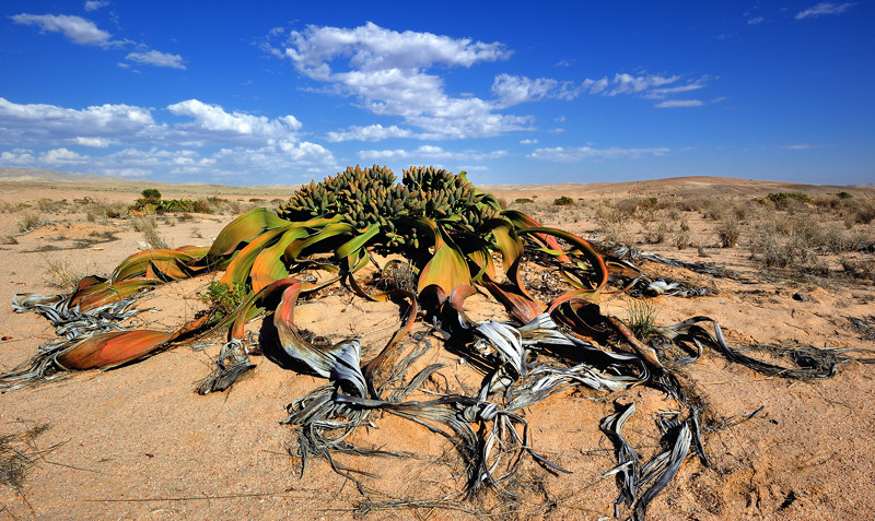 Qui vive anche la Welwitschia mirabilis, creatura diversa da qualsiasi altra vivente sulla Terra, in grado di sopravvivere in un luogo dove praticamente non si vede pioggia. Un albero con due sole foglie che a prima vista sembra quasi un ciuffo di alghe morte.