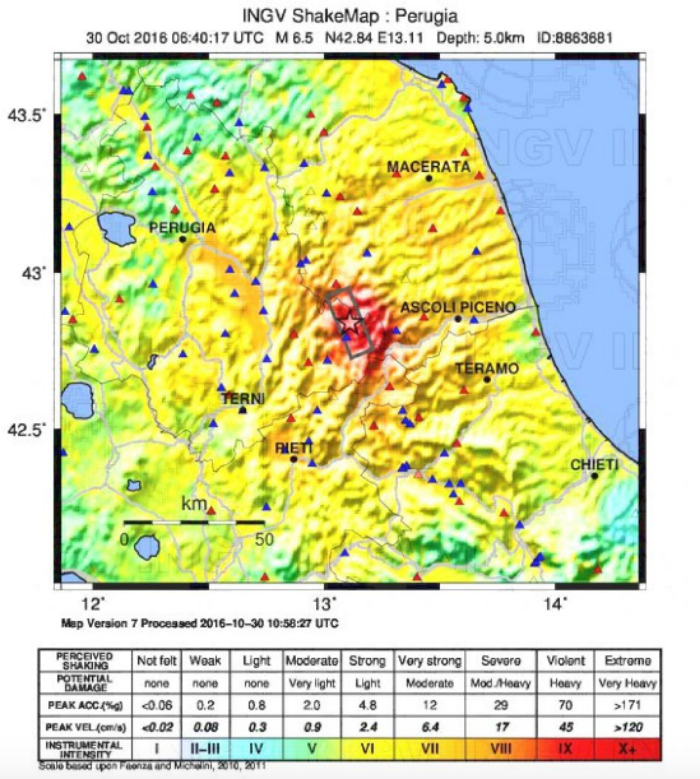 La legenda riportata alla base della figura indica la scala per la conversione da valori di accelerazione e velocità a intensità. Nel caso specifico, il valore massimo è superiore al grado VIII della scala MCS, mentre valori minimi ai bordi della mappa sono circa del V-VI grado.