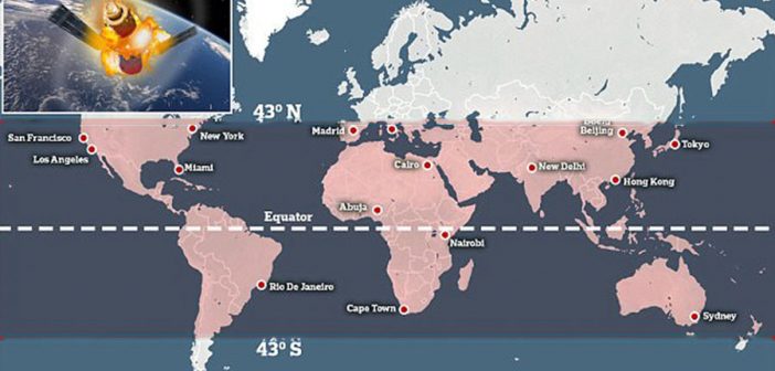 In linea di principio, il rientro potrebbe avvenire in qualunque località del pianeta compresa tra i 43 gradi di latitudine sud e i 43 gradi di latitudine nord. Tuttavia, tenendo conto che i frammenti, a causa di un’eventuale esplosione ad alta quota, potrebbero allontanarsi anche di un centinaio di km rispetto alla traiettoria originaria, le zone potenzialmente a rischio per la caduta di detriti devono essere estese di un grado di latitudine, quindi l’area da tenere sotto osservazione è in realtà quella compresa tra i 44 gradi di latitudine sud e i 44 gradi di latitudine nord. L’Italia è quindi divisa in due, con le località a nord del 44° parallelo escluse a priori da qualunque conseguenza, e quelle a sud potenzialmente a rischio. Tenendo conto della distribuzione degli oceani e delle terre emerse, e dell’inclinazione dell’orbita rispetto all’equatore, se i detriti di distribuissero su un arco di 800 km, la probabilità a priori che cadano tutti in mare è del 62%. Ma se i detriti si disperdessero su un arco di 2000 km, la probabilità che nessuno di essi precipiti sulla terraferma scenderebbe al di sotto del 50%. Quanto infine alla probabilità a priori che il rientro avvenga nella fascia di latitudine compresa tra i 35 e i 43 gradi nord, essa si aggira intorno al 18%.