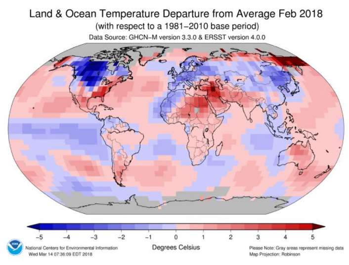 Secondo l’ultimo “Global Climate Report – February 2018” dei National centers for enviromental information della National oceanic and atmospheric administratio, la temperatura media globale combinata (superficie terrestre e oceani) del mese di Febbraio 2018 è stata l’undicesima più alta di sempre (+ 0.65 °C sopra la media del 20° secolo, pari a 12.1 °C). Per quanto riguarda la temperatura sulla superficie terrestre è la quindicesima più calda di sempre (+1,01° C sopra la media del XX secolo di 3,2° C). Per quanto riguarda gli oceani il febbraio 2018 è stato il settimo più caldo di sempre, ma quello con le temperatire più fredde a partire dal Febbraio 2013.