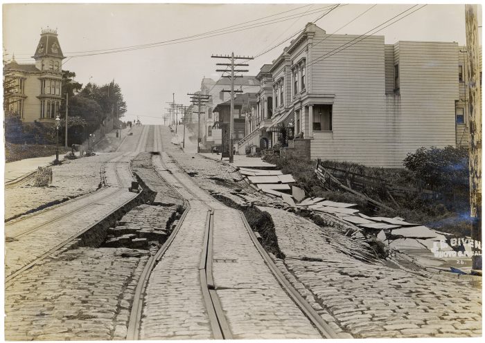 L’epicentro del terremoto è la Faglia di Sant’Andrea nell’Oceano Pacifico, una fenditura sottomarina della crosta terrestre, lunga oltre 1000 km e profonda 50, in cui si produsse una gigantesca spaccatura. Il movimento tellurico, che raggiunse gli 8,3 gradi della scala Richter, venne registrata dai sismografi di Londra e Tokyo. L’onda d’urto raggiunge la terraferma nei pressi di Point Arena, 140 km a nord di San Francisco, e continua la sua corsa verso sud. I villaggi di pescatori della zona vengono rasi al suolo, i binari delle ferrovie si piegano, alberi secolari vengono sradicati, i pali della luce si schiantano a terra. La scossa distrugge anche un ospedale per disabili mentali, uccidendo 87 persone, e fa letteralmente a pezzi le condutture che riforniscono d’acqua la città di San Francisco e l’area circostante.