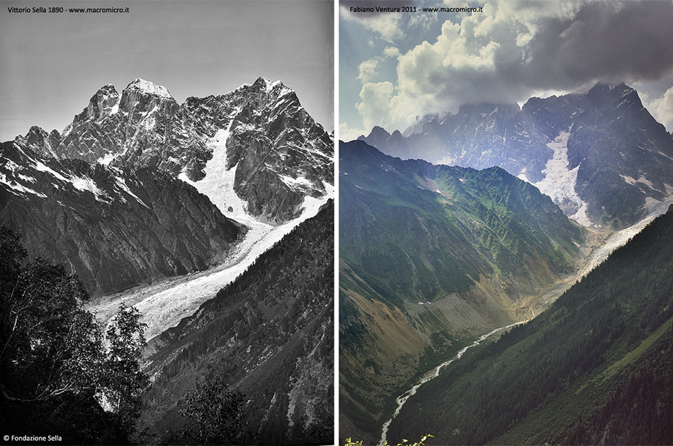 Il ghiacciaio Chaalati nel Caucaso georgiano fotografato a 121 anni di distanza. In questi anni la sua fronte si è arretrata di 2 km ed ha perso oltre 200 m di spessore. Sullo sfondo la parete sud del monte Ushba (5200m). A sinistra foto Vittorio Sella, 1890; © Fondazione Sella. A destra: foto Fabiano Ventura, 2011 – © Archivio F. Ventura