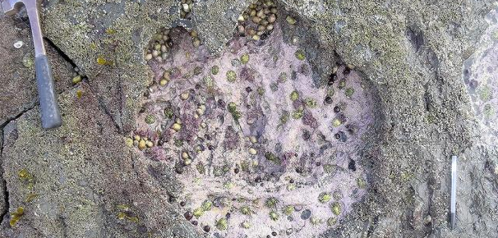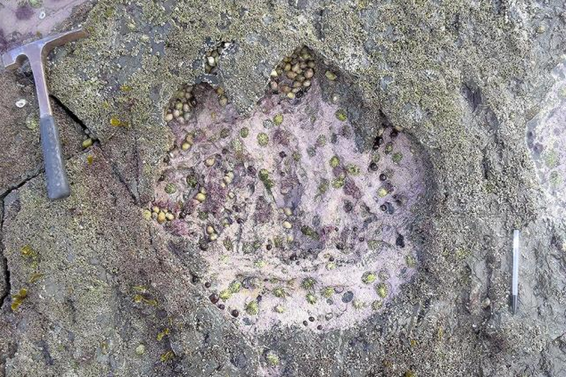 Queste grandi impronte potrebbero essere facilmente scambiate per pozze create dalle maree, ma ad uno sguardo più attento è possibile scorgere le forme delle zampe dei dinosauri.