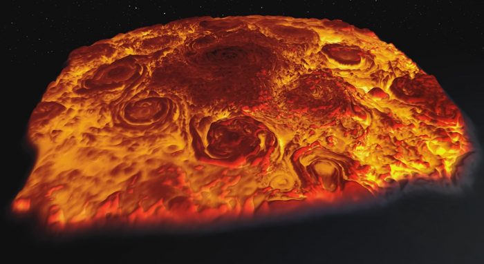 La “pizza” che potete ammirare qui sopra è stata sfornata ieri durante l’assemblea generale della European Geosciences Union, in corso a Vienna. Gli ingredienti sono i dati ottenuti dallo strumento Jiram – il Jovian InfraRed Auroral Mapper a bordo della sonda Juno – su cicloni e anticicloni che tempestano in formazione stretta i poli di Giove, recentemente svelati da una collaborazione internazionale a guida italiana. La novità è che, con quegli ingredienti, è stata preparata un’animazione tridimensionale che ci permette di sorvolare il polo nord gioviano. Se solo potessimo vederlo in infrarosso, come effettivamente fa Jiram.