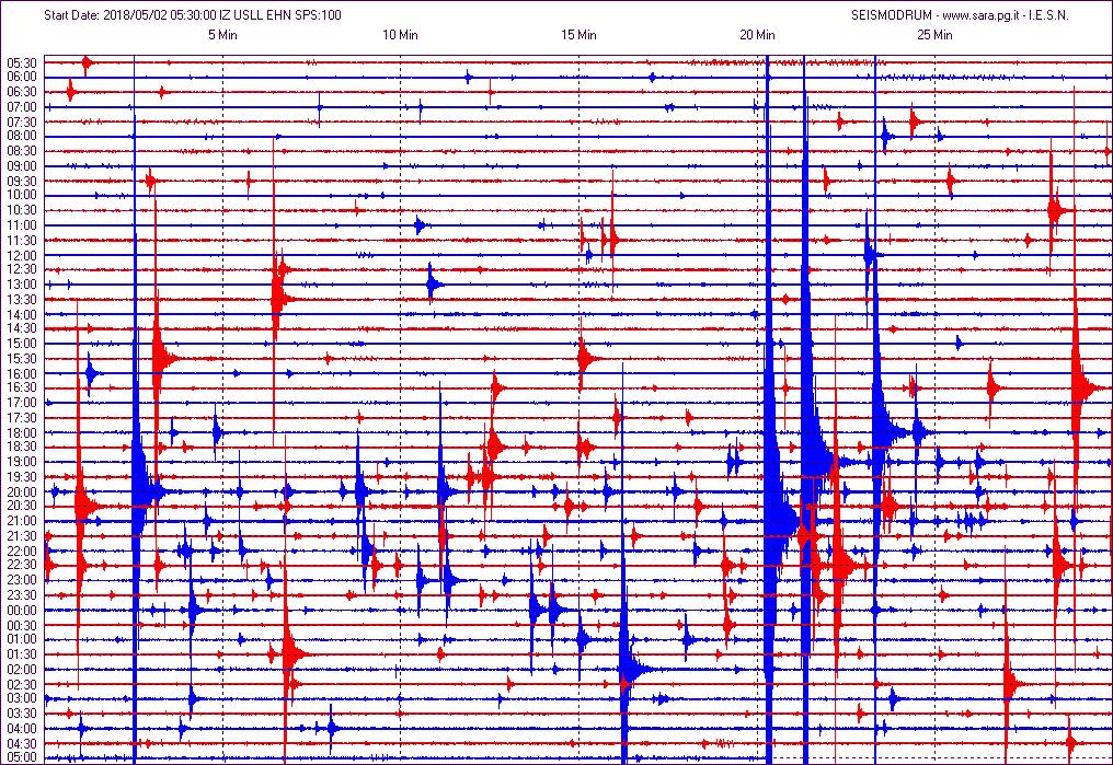 Almeno 7 gli eventi che, dalla mezzanotte del primo maggio, hanno raggiunto e superato M 2.0, con la scossa più forte di Ml 3.2, seguita da una di Ml 3.1 e tre altri eventi di cui uno di Ml 2.9 e due Ml 2.7