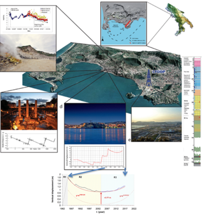 La figura mostra la caldera dei Campi Flegrei, insieme alle località più importanti per le osservazioni del fenomeno bradisismico e per le recenti ricerche scientifiche. Nella parte alta della figura, è riportato il rapporto H2O/CO2 negli ultimi 37 anni, analizzato in questo lavoro insieme ad altri dati geochimici rilevati nelle fumarole di Solfatara e Pisciarelli. E’ mostrato inoltre il sito di Bagnoli del progetto Campi Flegrei Deep Drilling, con la stratigrafia rilevata nel pozzo, che ha permesso di ridefinire l’estensione della caldera flegrea (in alto al centro). Nelle figure in basso, i dati di deformazione secolare (a sinistra) e dal 1950 ad oggi (a destra). Nella parte più bassa, è riportato l’ingrandimento del periodo dal 1984 ad oggi, per il quale il presente lavoro mostra, per la prima volta, il carattere speculare del sollevamento attuale rispetto all’abbassamento del periodo 1984-2003, che suggerisce lo stesso meccanismo di deflazione-inflazione di fluidi per entrambi gli episodi.