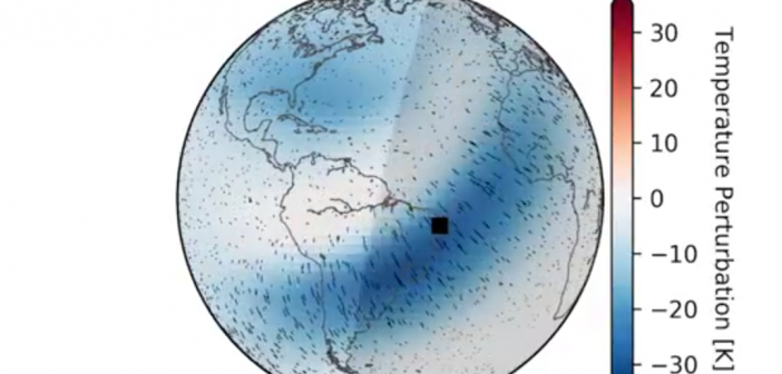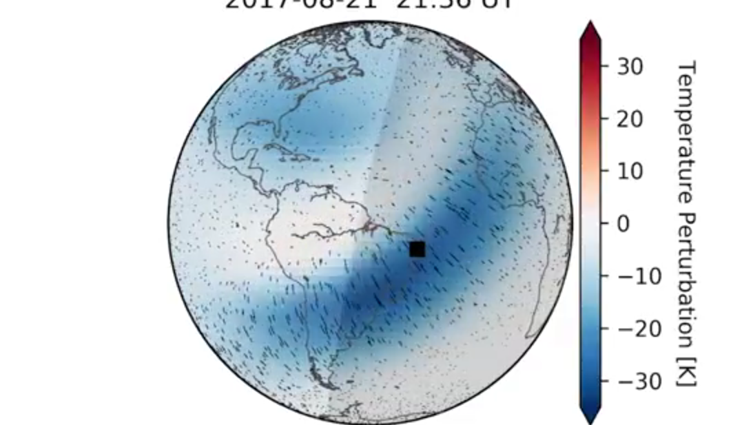 La sonda ha registrato un’onda in movimento nella termosfera dopo mezz’ora pasato il tramonto a São João do Cariri, praticamente 55 minuti dopo la fine dell’eclissi totale, come il team ha riportato il 24 aprile in uno studio comparso su Geophysical Research Letters . L’onda è stata prodotta dal movimento dell’ombra della luna, che ha raffreddato l’atmosfera sottostante. Quel punto freddo poi si è comportato come lo scarico di un lavandino, risucchiando l’aria più calda davanti a sé e causando un’increspatura nell’atmosfera mentre il punto freddo si muoveva attraverso il globo.