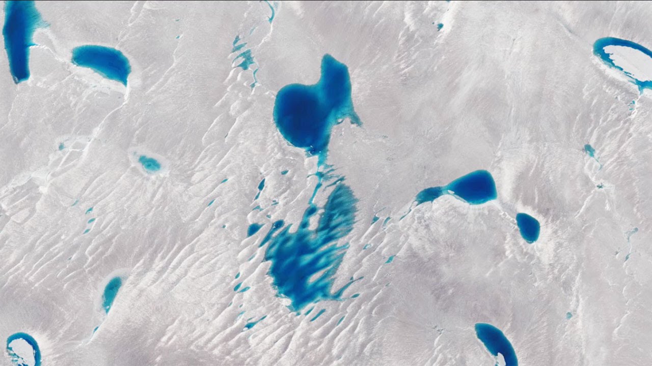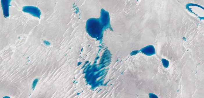 Piccoli laghi punteggiano la superficie del ghiacciaio Langhove nell’Antartide orientale. Fotografia via DigitalGlobe/Getty Images