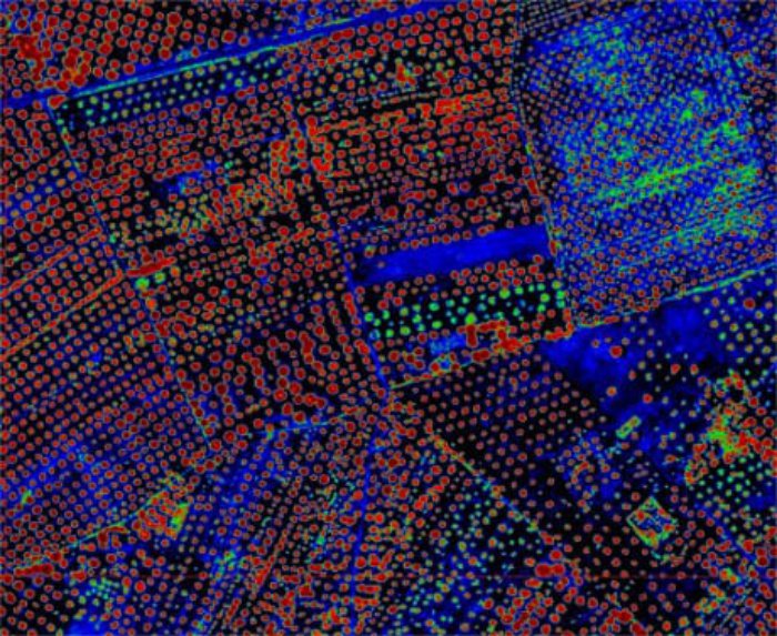 Il problema è che metodiche convenzionali di monitoraggio su larga scala, basate sulle immagini nello spettro dell’infrarosso, possono rilevare solo gli stadi avanzati di malattia, cioè quando sono apparenti la defogliazione apicale degli alberi, nonché l’avvizzimento e la clorosi (la mancata o insufficiente formazione di clorofilla) delle foglie. I sensori iperspettrali – così denominati perché riescono a esaminare più di un centinaio di bande di radiazione elettromagnetica – montati su satellite, d’altra parte, non hanno la risoluzione sufficiente a distinguere i diversi gruppi di alberi al suolo.