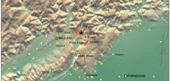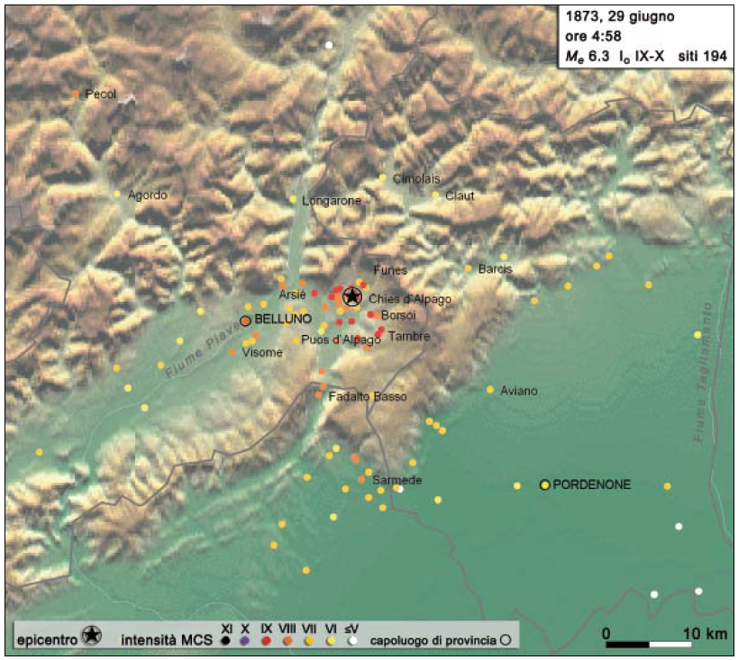 Ore 4:58 locali: è uno dei più forti dell’Italia nord-orientale. Ebbe una durata di circa 15 secondi, causò complessivamente 80 morti, 83 feriti e quasi 800 senzatetto. L’area più colpita è localizzata a nord del lago di Santa Croce, nella conca dell’Alpago, in provincia di Belluno, un’area montagnosa e semi agricola, con numerosi villaggi e paesi dove il terremoto causò estese distruzioni. Crolli diffusi avvennero anche nel trevigiano e nelle località a sud dell’altopiano della foresta del Cansiglio. Danni gravi, descritti minuziosamente dagli scienziati del tempo, furono rilevati in tutto il territorio compreso nell’area Belluno-Pordenone-Conegliano. In sette località dell’Alpago il terremoto causò le distruzioni maggiori, con danni che sfiorarono il grado X MCS. Furono quasi completamente rasi al suolo: Pieve d’Alpago con la frazione Curago, Puos d’Alpago con la sua frazione Cornei, il paese di Borsoi, nel comune di Tambre, e le località di Funes e Lamosano (entrambe frazioni di Chies d’Alpago). La fortissima scossa fu sentita in tutto il nord Italia fino a Genova e Torino, e verso sud fino alle Marche meridionali e all’Umbria. Di là dalle Alpi fu avvertita a Vienna, Lubiana, Lucerna, Augsburg, Innsbruck e in molte altre località della Svizzera, dell’Austria, della Slovenia e della Baviera. Chiese crollate, semi crollate o lesionate, case inabitabili: un quadro di desolazione che pesò per anni su una popolazione pressoché priva di risorse. Oltre ai paesi sopra citati, altre 15 località ebbero estese distruzioni, con numerosi crolli totali di edifici (effetti di grado IX MCS o di poco inferiori, si veda l’elenco delle località classificate in Appendice). Sintetizziamo i danni principali nella vasta area colpita, dentro e fuori l’Alpago. Nel comune di Chies d’Alpago la scossa fece crollare quasi tutti i fabbricati dell’abitato di Alpaos. Nel paese di Chies ci furono molti crolli e vittime. Ad Arsiè tutte le case, tranne una, divennero inagibili. Numerosi crolli a Plois e danni ingenti a Quers e a Torres. Gravissimi danni colpirono Tambre con le sue frazioni Tambruz, Valdenogher e Lavina di Sopra, e Farra d’Alpago. Nella vallata del Piave, nei pressi di Belluno, il sisma rese inabitabili circa la metà delle case di Soccher, frazione del comune di Ponte nelle Alpi, e danneggiò gravemente un terzo dell’abitato di Visome, nel territorio comunale di Belluno.