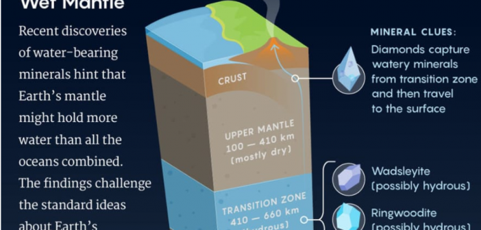 Alcuni minerali idrati rivelano che il mantello terrestre potrebbe contenere più acqua di tutti gli oceani del nostro pianeta. Ma l’origine di questa acqua che potrebbe trovarsi a centinaia di chilometri di profondità resta ancora un mistero