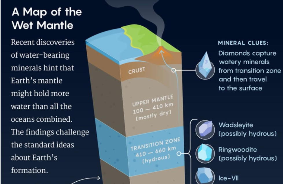 Da allora, gli scienziati hanno trovato altre eccitanti prove della presenza di acqua. A marzo, un gruppo ha annunciato di aver scoperto diamanti dal mantello della Terra che racchiudono vera e propria acqua al loro interno. I dati sismici hanno anche mappato minerali di questo tipo
