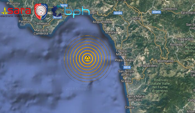 Epicentro in mare, 16 km al largo della costa di Praia a Mare (CS). Ipocentro molto profondo, a oltre 280 km