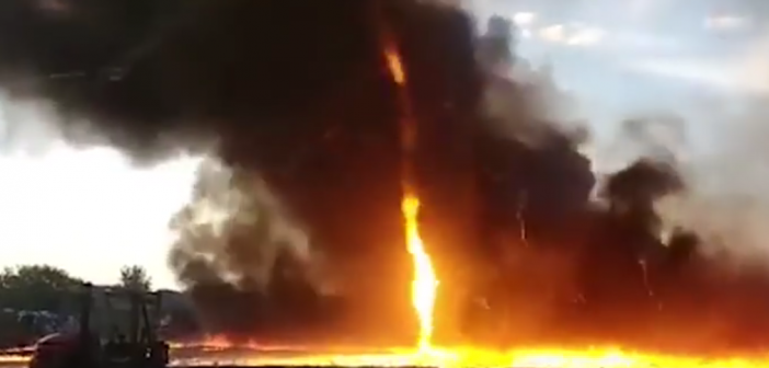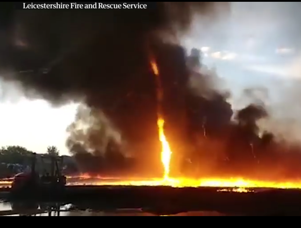 Un video che mostra un inferno a spirale che inghiotte una fabbrica britannica prima di spingere un “firenado” verso il cielo ad un’altezza di oltre 15 metri è diventato virale dopo essere stato pubblicato su facebook dalla Leicestershire Fire and Rescue Service, Ashby Station.