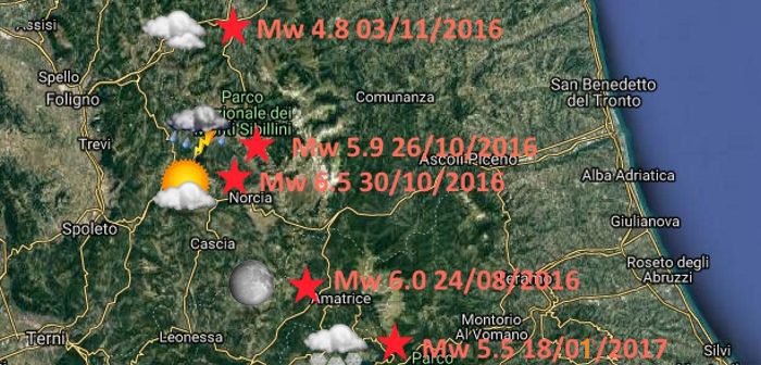 “Quella nottata fu caratterizzata da precipitazioni sparse per il transito di una perturbazione da nord ovest sull’Italia, che portò delle piogge anche sul versante adriatico dell’appennino la mattina seguente la scossa” ci spiega Cavallucci. Ma è andando ad analizzare le ultime scosse più rilevanti, che la casistica si amplia ancora di più, perchè il 18 gennaio 2017, ben 4 eventi con magnitudo pari o superiore a 5.0, culminate in un evento di Mw 5.5, colpirono la zona di Campotosto, al confine tra Lazio ed Abruzzo.