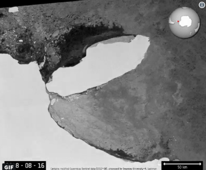 Il colossale iceberg staccatosi dall’Antartide nel luglio del 2017 ha iniziato a spostarsi verso nord e a ruotare su stesso dopo un anno di relativa calma. A68, che contiene oltre un trilione di tonnellate di ghiaccio rischia concretamente di scontrarsi con la parte settentrionale della piattaforma Larsen-C, con esiti potenzialmente catastrofici sul traffico marittimo a causa dei numerosi e piccoli iceberg che potrebbero generarsi dalla collisione.