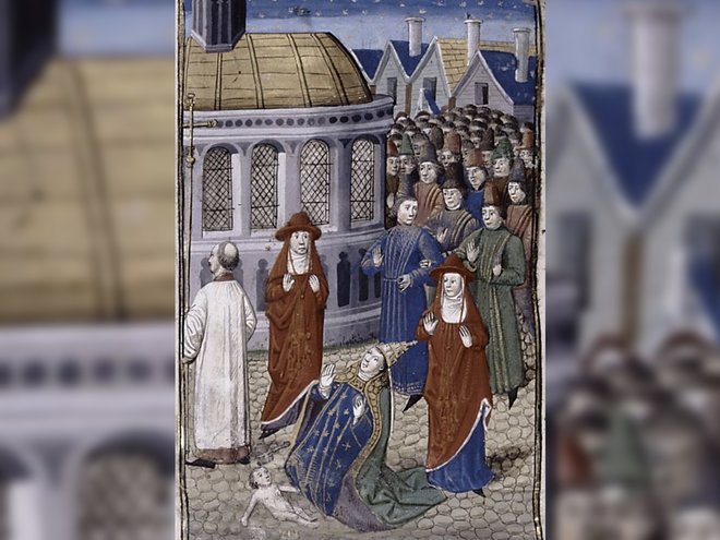 Questa opera d’arte in miniatura mostra papa Giovanna, che ha appena dato alla luce un bambino durante una processione della Chiesa. Credits: biblioteca pubblica di New York