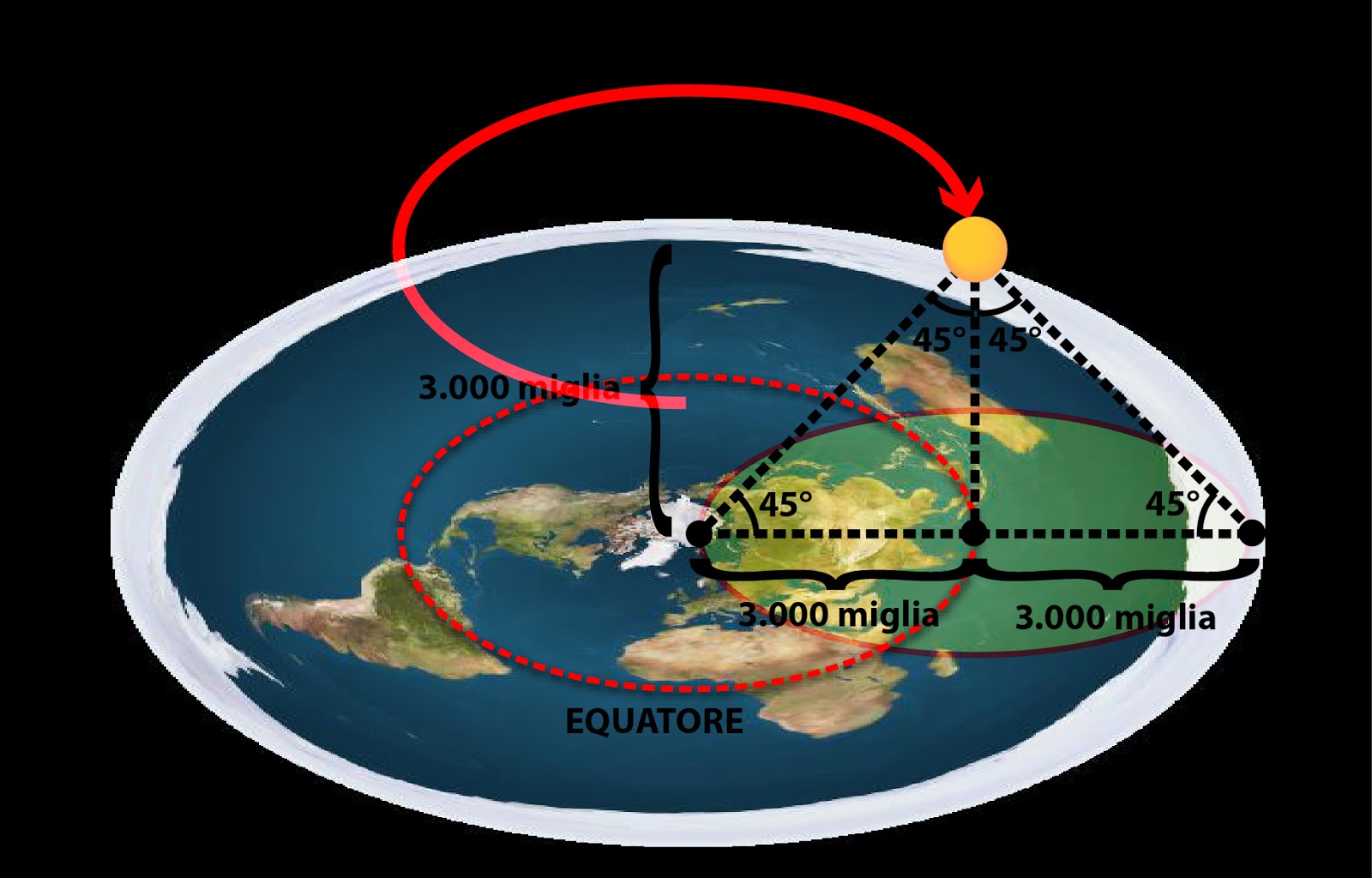 ma se il raggio della terra piatta è 6000 miglia (9500 km circa), come è possibile che l’Africa, avendo la distanza tra il punto più a nord e quello più a sud di circa 8000 km, sia così piccola?