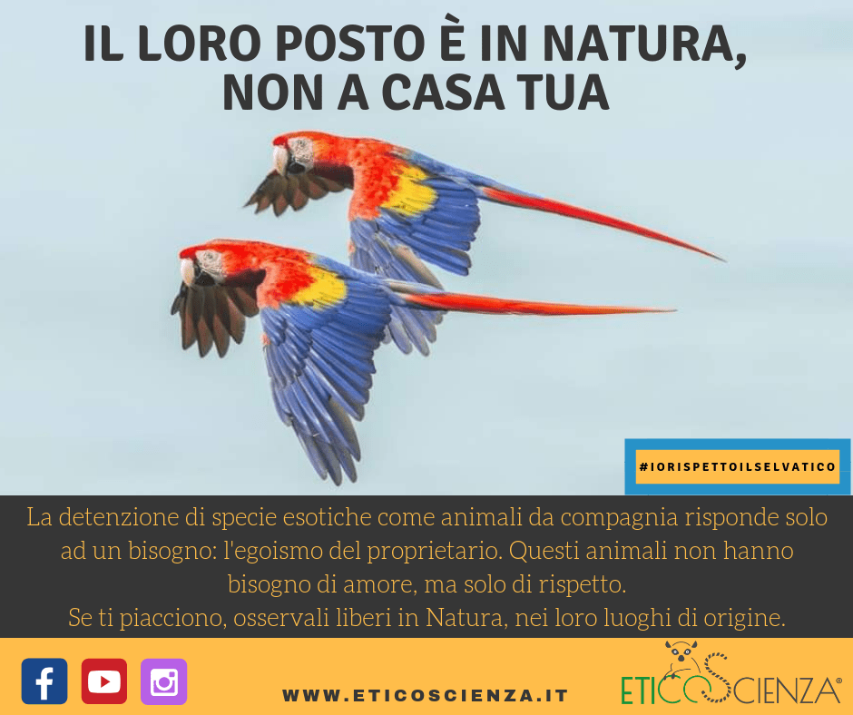 Tenere a casa specie esotiche come animali da compagnia, o come oggetti di collezionismo, é un riflesso antropocentrico della voglia di “portarsi a casa la Natura”. La maggior parte degli animali esotici che vengono usati come pet sono animali selvatici. Ricordiamoci che un individuo di una specie selvatica, anche se viene tenuto a casa, non diventa domestico ma é solo addomesticato. Questo implica che i suoi bisogni rimangono quelli di un animale selvatico.