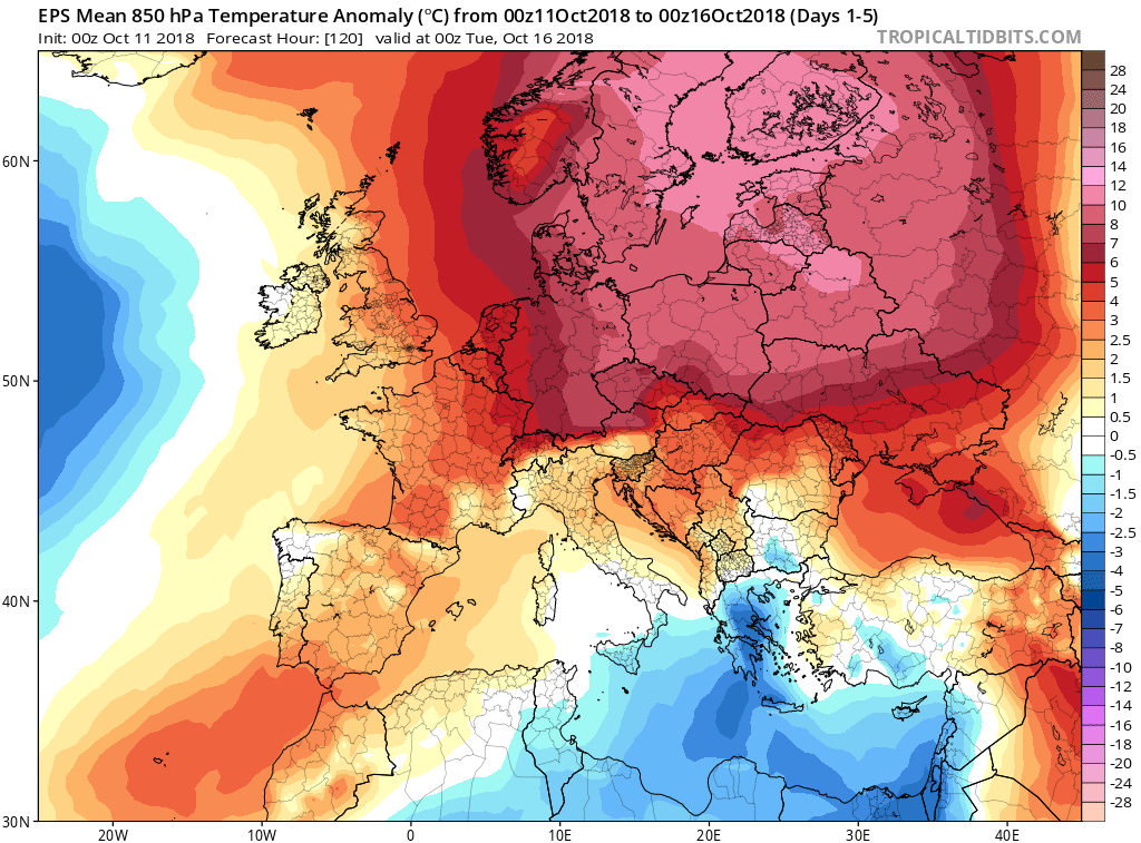 Anomalia di temperatura (2 m di temperatura) in tutta Europa da venerdì 12 a lunedì 15 ottobre. Modello GFS. Mappa: Wxcharts.eu