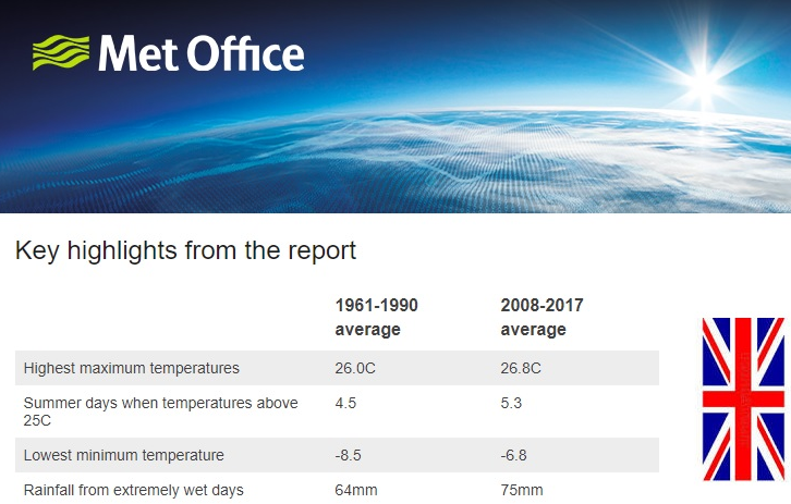 Secondo i meteorologi del Met Office, «Confrontando diversi periodi di riferimento meteorologico, è possibile osservare una serie di tendenze interessanti. Ad esempio, il giorno più caldo di ogni anno nel decennio più recente (2008-2017) nel Regno Unito è stato in media di 0,8° C più caldo rispetto al giorno più caldo di ogni anno nel periodo 1961-1990. Al contrario, la temperatura più bassa dell’anno ha mostrato un aumento ancora maggiore, diventando più moderata di 1,7° C tra i due periodi nel Regno Unito».