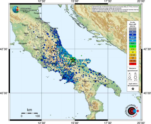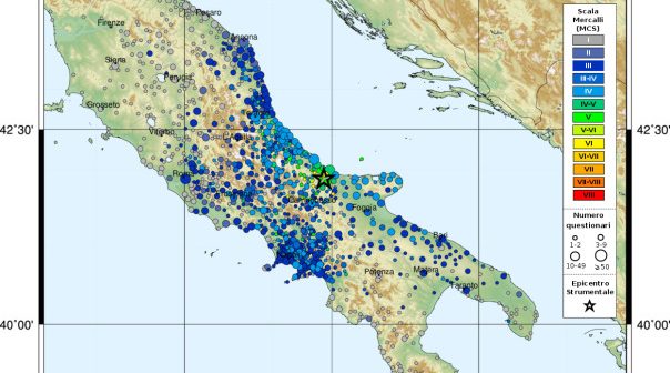 L’INGV dal 1997 gestisce un sito internet per raccogliere i dati sugli effetti dei terremoti in Italia tramite la partecipazione volontaria dei cittadini e, dal 2007, mette a disposizione di tutti, in tempo reale, le mappe degli effetti macroscopici dei terremoti (chiamate per questo “macrosismiche”; Figura 1) ottenute con tali dati [Tosi et al., 2015].