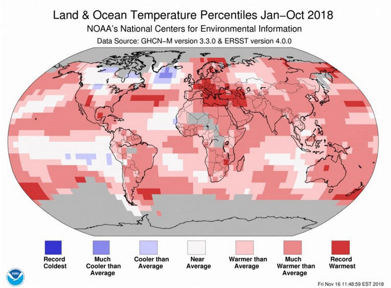 La temperatura media globale della superficie marina a ottobre è stata la seconde più alta mai registrata e per quanto riguarda gli oceani gli anni 2014-2018 comprendono i cinque ottobri più caldi mai registrati, con il 2015 che è risultato l’ottobre più caldo con 1,57 ° C sopra la media. E novembre è cominciato con i micidiali incendi che hanno devastato la California.