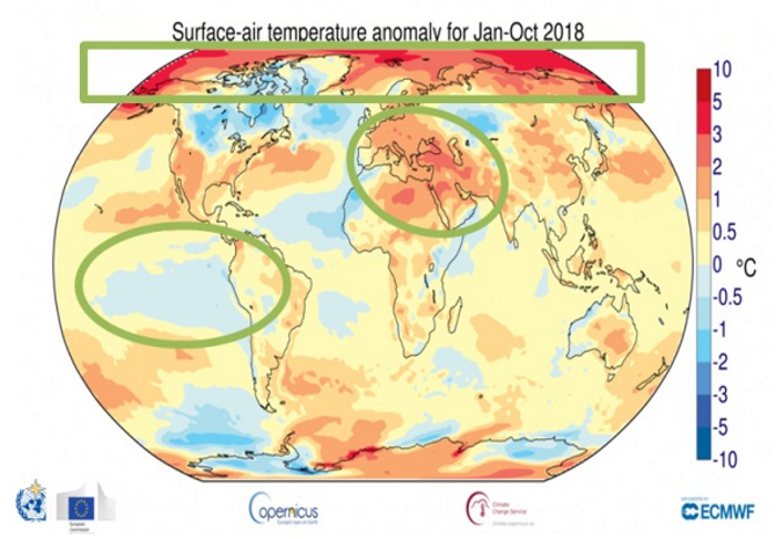Temperature: L’inizio del 2018 è stato segnato da un episodio de La Niña di debole intensità che è proseguito fino a marzo. Ma a ottobre le temperature di superficie del mare nell’est del Pacifico tropicale sembravano indicare il ritorno di condizioni associate in generale al fenomeno di El Niño, anche se nell’atmosfera queste condizioni non si sono ancora manifestate. Se si concretizzerà un episodio El Niño, il 2019 sarà senza dubbio più caldo del 2018.