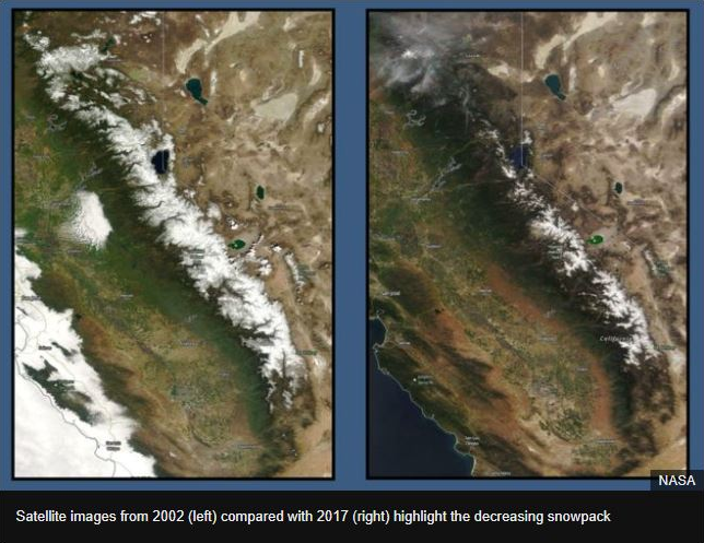La neve che ricopre le montagne in inverno è vitale per l’approvvigionamento idrico di milioni di persone r l’approvvigionamento di acqua dolce, in particolare in California dove le dighe che riforniscono campi e città vengono riempite dallo scioglimento annuale delle nevi.